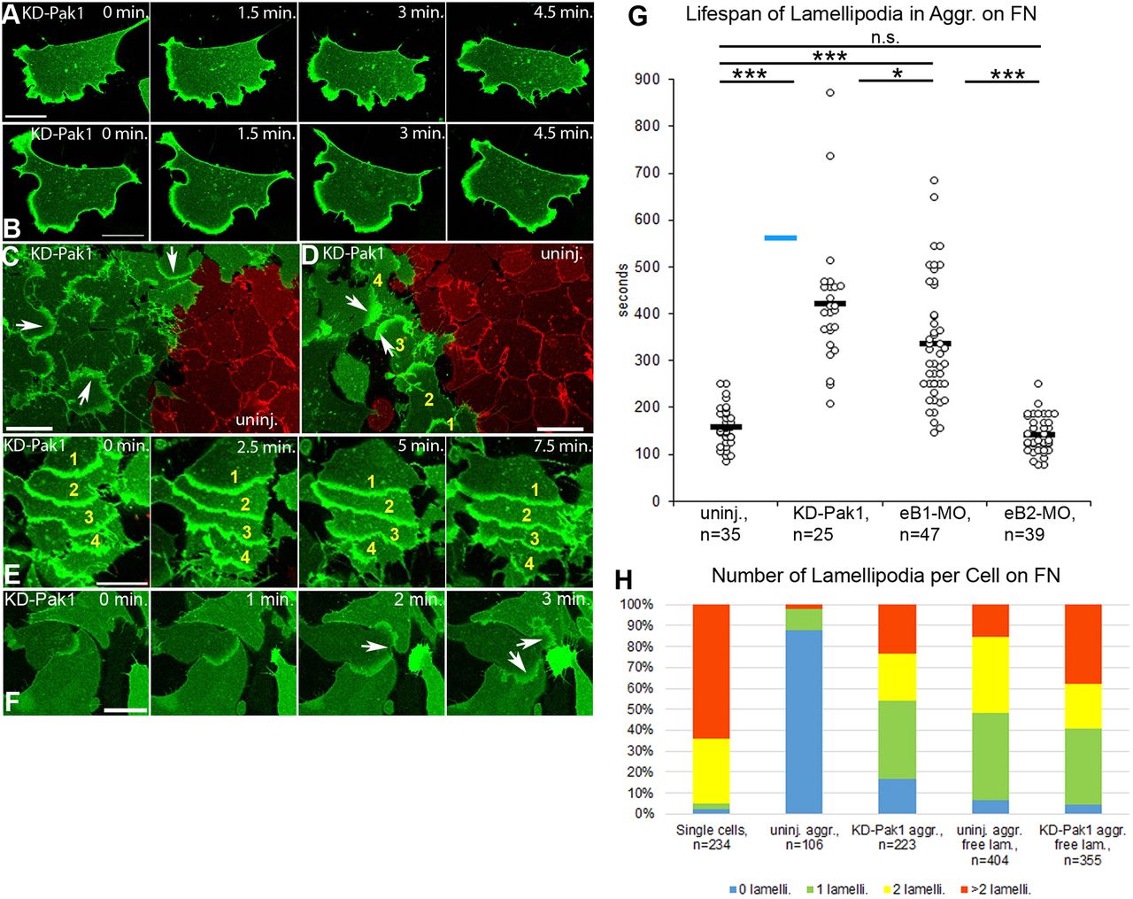 KD-Pak1 expression overcomes contact inhibition of lamellipodia. (A,B) Isolated LEM cell expressing KD-Pak1 on FN. (C,D) LEM aggregate with KD-Pak1-expressing cells (membrane-GFP, green) and control cells (membrane-RFP, red). White arrows show smooth-rimmed lamellipodia, yellow numbers indicate serially underlapping cells. (E) Time series of oriented underlapping cells (yellow numbers). (F) Lamellipodium splitting in two upon contact (white arrows). (G) Lifespan of lamellipodia. Blue bar indicates mean value of single cells on FN; black bars indicate the mean values. Statistical significance: *P<0.05, ***P<0.0001, n.s., not significant. (H) Percentage of cells having the indicated number of lamellipodia per cell. Scale bars: 30â