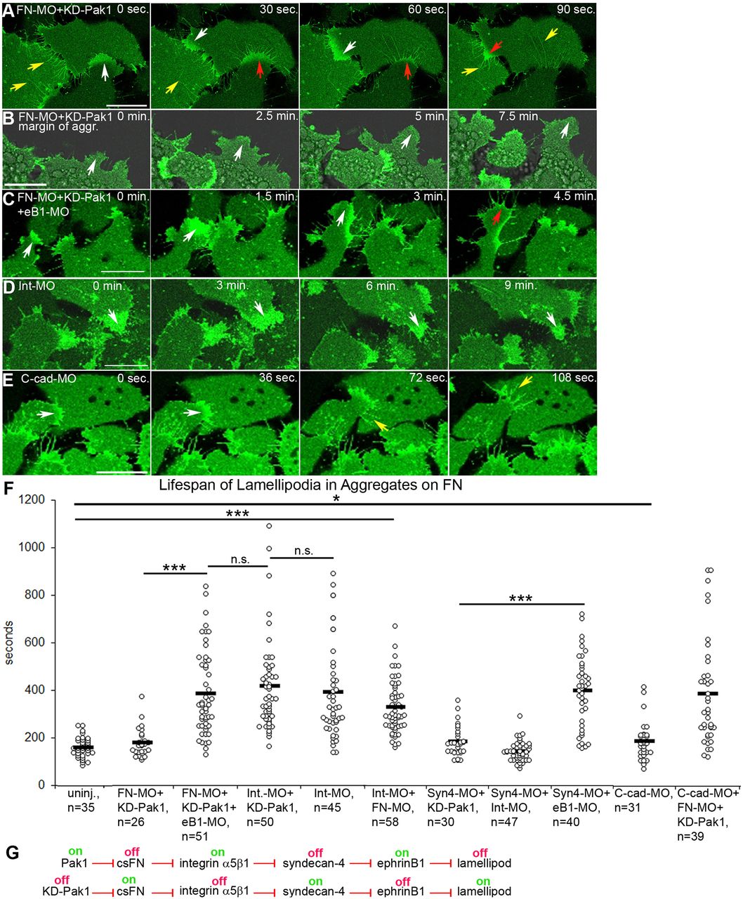 csFN, integrin α5β1, syndecan 4 and C-cadherin regulate contact-induced lamellipodia collapse. (A-E) Frames from confocal time-lapse movies of LEM aggregates on FN, labeled with membrane-GFP. (A,B) Cells injected with FN-MO, KD-Pak1 mRNA and mbGFP mRNA, (A) submarginal region, (B) explant margin. Yellow arrows point to filopodia, white arrows point to advancing lamellipodia, and red arrows point to retracting lamellipodia in all panels. (C) LEM aggregates injected with FN-MO, KD-Pak1 mRNA and eB1-MO. LEM aggregates injected with (D) integrin β1-MO or (E) C-cadherin-MO. (F) Lifespan of lamellipodia. Black bars indicate the mean values. Statistical significance: *P<0.05, **P<0.001, ***P<0.0001, n.s., not significant. (G) Pathway deduced from experiments. Scale bars: 30â
