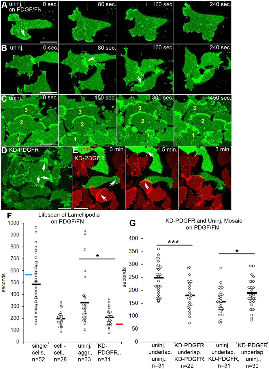 PDGF signaling promotes submarginal protrusion formation in LEM aggregates. (A-E) Frames from time-lapse recordings of membrane-GFP-labeled LEM cells on PDGF-FN. (A,B) Single cells, white arrows show lamellipodia. (C) Serial underlapping of lamellipodia (yellow numbers) in LEM aggregate. (D) KD-PDGFR-expressing aggregates exhibiting small, nonaligned lamellipodia (white arrows). (E) Mosaic of control (membrane-RFP, red) and KD-PDGFR-expressing cells (membrane-GFP, green). White arrows indicate underlapping lamellipodia. (F,G) Lifespan of lamellipodia on PDGF-FN. Black bars indicate mean values, blue bar indicates mean for single cells on FN, red bar indicates mean for aggregates on FN. Significance: *P<0.05, ***P<0.0001. Scale bars: 30â