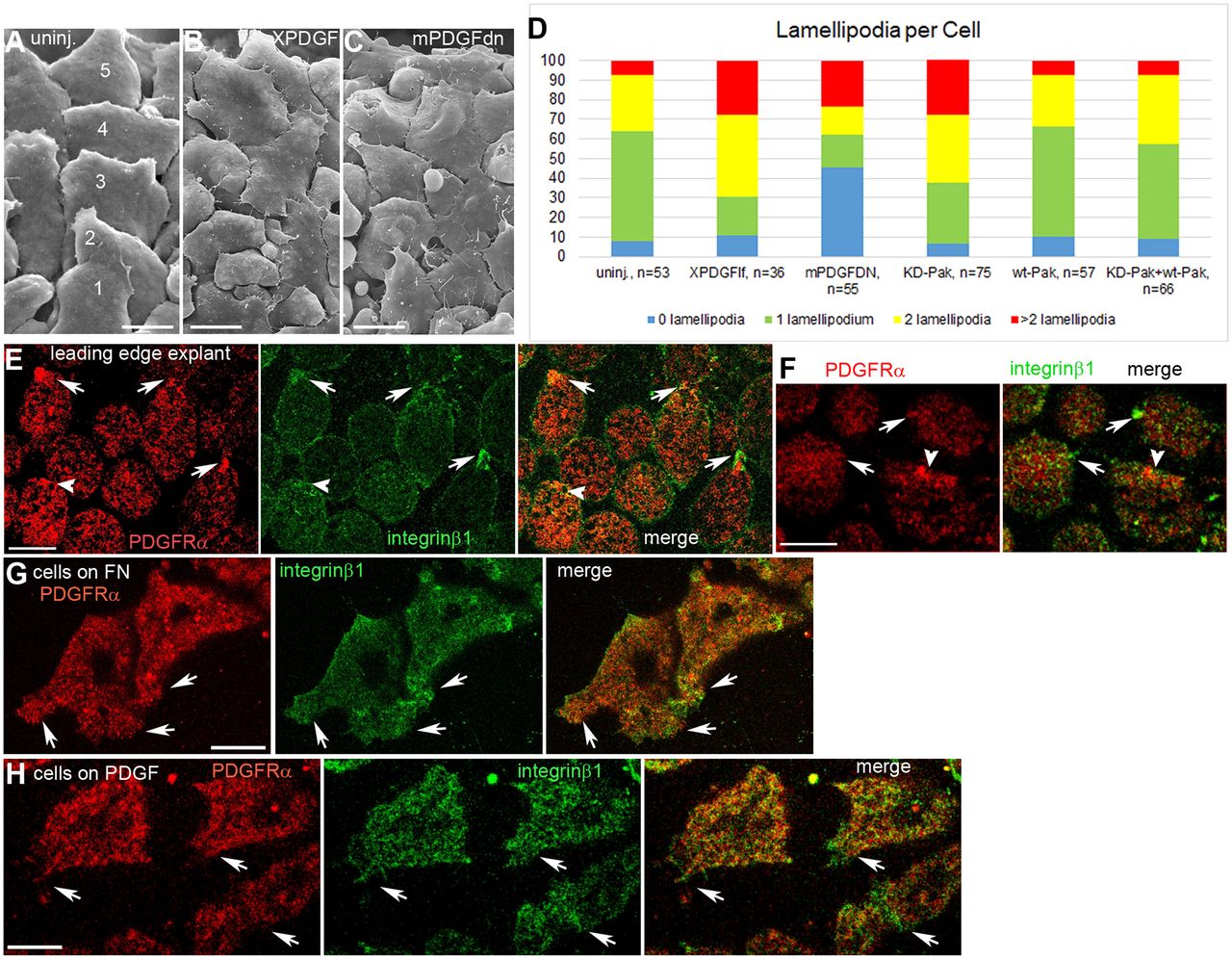 PDGF-A signaling controls protrusive activity in the embryo. (A-C) SEM images of the substratum-facing surface of the LEM after removal of the BCR of uninjected (A), matrix-binding Xenopus lf-PDGF-A (B), and dominant-negative mouse mPDGF-A (C)-expressing gastrulae. (D) Lamellipodia per cell under different experimental conditions, as determined from SEM images. (E,F) Formerly substratum-attached surface of LEM double-stained with PDGFRα (red) and integrin β1 (green) antibodies. Arrows indicate protrusions, whereas arrowheads indicate receptor accumulations in absence of protrusions. (G,H) Single LEM cells on FN (G) or PDGF-FN (H) double-stained for PDGFRα (red) and integrin β1 (green). Arrows indicate protrusions. Scale bars: 30â