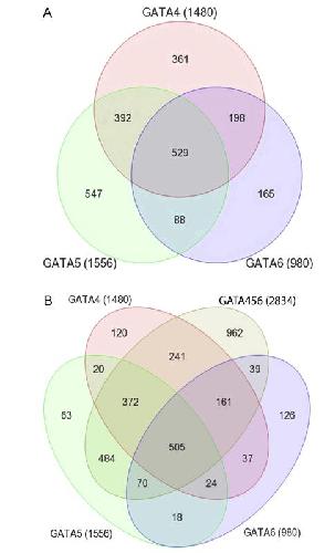 Fig. 1.Venn diagrams of numbers of genes that are differentially expressed compared to Activin-injected control with at least a two-fold reduction in expression and an adjusted p value of 0.05. A: gata-dependent genes with decreased expression insingle gata4, gata5 or gata6 knockdown, respectively (for list of genes, seeTable 1). B: gata dependent genes with decreasedexpression in triple gata4, gata5 or gata6 knockdown compared to those with decreased expression in single gata4, gata5 and gata6 knockdown, respectively (for list of genes, seeTable 2).