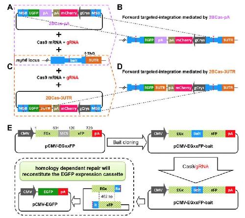 The clustered regularly interspaced short palindromic repeats (CRISPR)/CRISPR-associated (Cas) 9 system has emerged as a powerful tool for knock-in of DNA fragments via donor plasmid and homology-independent DNA repair mechanism; however, conventional integration includes unnecessary plasmid backbone and may result in the unfaithful expression of the modified endogenous genes. Here, we report an efficient and precise CRISPR/Cas9-mediated integration strategy using a donor plasmid that harbors 2 of the same cleavage sites that flank the cassette at both sides. After the delivery of donor plasmid, together with Cas9 mRNA and guide RNA, into cells or fertilized eggs, concurrent cleavages at both sides of the exogenous cassette and the desired chromosomal site result in precise targeted integration without plasmid backbone. We successfully used this approach to precisely integrate the EGFP reporter gene into the myh6 locus or the GAPDH locus in Xenopus tropicalis or human cells, respectively. Furthermore, we demonstrate that replacing conventional terminators with the endogenous 3UTR of target genes in the cassette greatly improves the expression of reporter gene after integration. Our efficient and precise method will be useful for a variety of targeted genome modifications, not only in X. tropicalis, but also in mammalian cells, and can be readily adapted to many other organisms.-Mao, C.-Z., Zheng, L., Zhou, Y.-M., Wu, H.-Y., Xia, J.-B., Liang, C.-Q., Guo, X.-F., Peng, W.-T., Zhao, H., Cai, W.-B., Kim, S.-K., Park, K.-S., Cai, D.-Q., Qi, X.-F. CRISPR/Cas9-mediated efficient and precise targeted integration of donor DNA harboring double cleavage sites in Xenopus tropicalis.