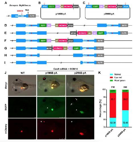 directions. J ) Representative images of tadpoles injected with Cas9 mRNA and gRNA-GGN18, together with p1M6B-pA (1BCas)