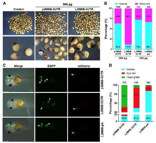 p2M6B-3UTR plasmid and linear EGFP cassette with 3UTR (L2M6B-3UTR) were injected into fertilized eggs (500 pg/egg),