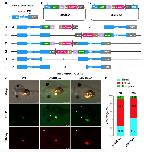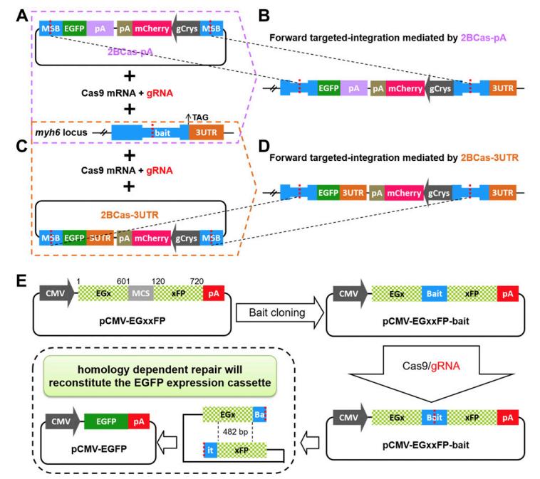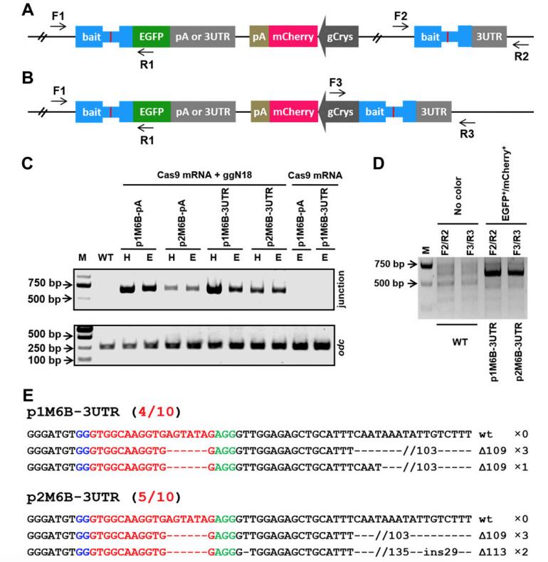 Figure 4. Genotyping analysis of targeted integration in positive founder tadpoles. A, B) Schematics of genotyping RT-PCR primer design for forward targeted integration of the exogenous cassette induced by the 1BCas (A) or 2BCas (B) strategies. F1/R1 primer pair was used to amplify the 59 junction between the genome and exogenous DNA. F2/R2 primer pair was used to amplify the 39 junction for the 1BCas strategy, whereas F3/R3 primer pair was used to amplify the 39 junction for the 2BCas strategy. C) Representative RT-PCR assay data revealed the 59 junctions of forward targeted integrations at the myh6 locus in potential founder tadpoles that were injected with 1BCas-pA, 2BCas-pA, 1BCas-3UTR, or 2BCas-3UTR strategies. RT-PCR fragments of odc from the genome of tadpoles were used to monitor the quality of genomic DNA. D) Representative RT-PCR assay data revealed 39 junctions of forward targeted integrations at the myh6 locus in founder tadpoles that were injected with 1BCas-3UTR and 2BCas-3UTR strategies. E) DNA sequencing data revealed the 39 junctions that contained indels both in gRNA targeted region and downstream. The ratio of colons with targeted integration was shown in brackets at the top panel. For all panels, wild type (WT) sequence is shown at top with the target site in red and the PAM sequence in green. E, tadpoles with only eye-specific expression of mCherry; H, tadpoles with specific expression of EGFP in heart in addition to eye-specific expression of mCherry; M, DNA marker; EGFP+ /mCherry+ , tadpoles with specific expression of EGFP in heart in addition to eye-specific expression of mCherry; WT, wild-type tadpoles without injection.