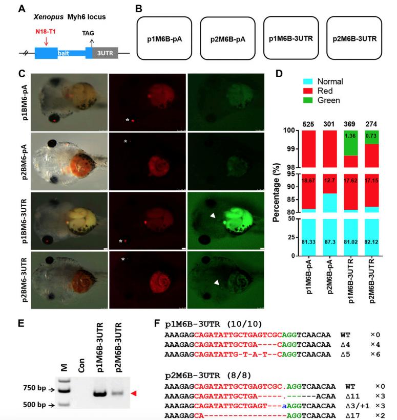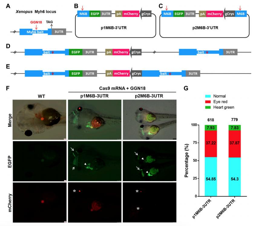 Schematic illustration of gRNA-GGN18 targeted the intron region of the bait sequence at the myh6 locus of X. tropicalis. B, C)