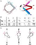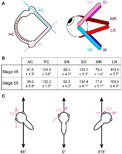 Figure 1. Arrangement of eye muscle pulling directions and semicircular canal planes. (A) Schematics depicting the spatial alignment of the three semicircular canals (left) and the six extraocular muscles (right) of the left inner ear and eye, respectively; note that color-coded antagonistic pairs of eye muscles are approximately aligned with individual semicircular canals. (B) Mean orientation of vertical semicircular canals and eye muscle pulling directions (± SEM) relative to the body length axis in tadpoles at developmental stage 46 and 55 (from n = 5 animals, respectively). (C) Exemplary orientations of semi-intact tadpole preparations either longitudinally on the linear sled (0°, middle) or in positions in which the SO eye muscle (magenta arrow) was either oriented parallel (left, 45°) or perpendicular (right, 315°) to the translational motion direction (double-headed black arrow). HC horizontal semicircular canal; AC, PC anterior, posterior vertical semicircular canal; IO, IR, inferior oblique, rectus muscle; LR, MR, lateral, medial rectus muscle; SO, SR, superior oblique, rectus muscle.