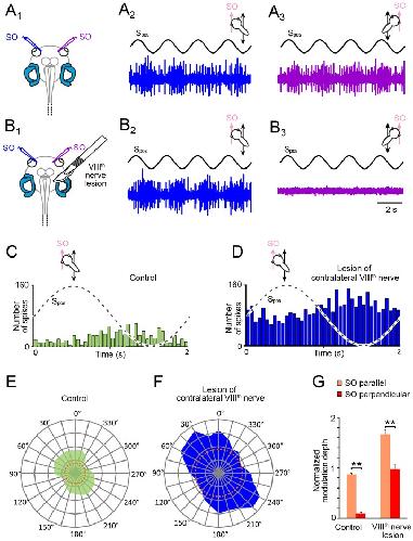 Figure 3. Consequences of unilateral VIIIth nerve lesions on motion-induced SO nerve firing rate modulation. (A,B) Discharge modulation of bilateral SO nerves during four cycles of sinusoidal horizontal linear translation on a sled at 0.5 Hz and 0.49 m/s2peak acceleration (Spos; black traces) before (A1) and after transection of the right VIIIth nerve (B1); for maximal discharge modulation, preparations were positioned such that the left (A2,B2; blue traces) and right SO muscle (A3,B3; violet traces) were oriented parallel to the translation direction, respectively; note the complete loss of SO nerve spike activity on the ipsilesional (B3) and persistence of firing rate modulation on the contralesional side (B2). (CâF) PSTHs (bin width: 50 ms) of averaged firing rate modulation over a single cycle (dashed sine waves in C,D) of sled motion (from n = 20â30 cycles) and polar plot of modulation magnitudes across 360° of translational motion (E,F) of the contralateral SO nerve before (C,E) and after VIIIth nerve transection (D,F); data in (CâF) derive from the typical example depicted in (A,B); dotted orange circles in (E,F) indicate the respective resting discharge rates. (G) Bar plot of normalized SO motor nerve firing rate modulation during translation parallel (orange) and perpendicular (red) to the SO eye muscle pulling direction (n = 8) before and after VIIIth nerve transection. SO, superior oblique; Spos, stimulus position of the sled.