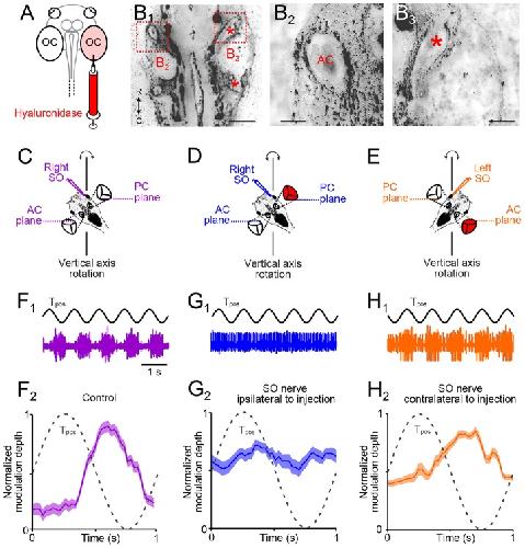 Figure 4. Morpho-physiological correlates of impaired angular VOR in unilateral semicircular canal-deficient Xenopus tadpoles. (A) Scheme depicting the injection of the hyaluronidase into the right otic capsule (OC, light red). (B1âB3) Overview (B1) of a horizontal section through the head of a stage 55 tadpole, which received a hyaluronidase injection into the right otic capsule at stage 44; higher-magnification of the boxed areas in (B1) of the left (B2) and right inner ear (B3), indicating that semicircular canals developed on the left but not on the right side (red * in B1, 3 indicate putative locations of AC and PC). (CâE) Schematics of positional orientations of the preparations to record the right (C,D) and left (E) SO nerve during vertical-axis rotation; positional arrangements allow selective rotational stimulation at 1 Hz and ± 60°/s peak velocity of the right PCâleft AC (C,D) or left PCâright AC (E), without stimulation of the utricle. (F) Spike discharge modulation of the right SO nerve during five cycles of sinusoidal turntable rotation (Tpos; black trace in (F1)) and averaged firing rate (mean ± SEM; F2) over a single cycle (dashed sine wave in F2) in a control. (G,H) Spike discharge modulation of the right (G1) and left SO nerve (H1) during sinusoidal rotation [Tpos; black traces in (G1,H1)] in a preparation from a typical unilateral (right side) semicircular canal-deficient tadpole (red labeled inner ear); averaged firing rates (mean ± SEM; G2,H2) over a single cycle (dashed sine waves in G2,H2) show the loss of the excitatory (G2) or inhibitory response component (H2); the averaged firing rate modulation over a single cycle in (F2,G2,H2) was obtained from 20â30 cycles, respectively. AC, PC, anterior, posterior vertical semicircular canal; SO, superior oblique; Tpos, stimulus position of the turntable, C, caudal; R, rostral. Calibration bar represents 2 mm in (B1) and 0.5 mm in (B2,B3).