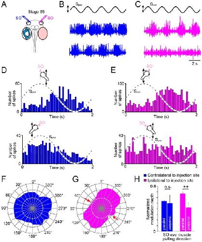 Figure 5. Impact of unilateral semicircular canal-deficiency on the developmental tuning of translational motion-evoked SO nerve responses. (A) Schematics depicting the presence of semicircular canals in the left and the absence thereof in the right inner ear in a stage 55 tadpole. (B,C) Spike discharge of the left (B) and right SO nerve (C) during four cycles of sinusoidal horizontal linear translation on a sled at 0.5 Hz and 0.49 m/s2peak acceleration (Spos; black trace) in a direction parallel (upper blue and magenta trace) and perpendicular to the SO eye muscle pulling direction (lower blue and magenta trace), respectively. (D,E) PSTH (bin width: 50 ms) of averaged firing rate modulation over a single cycle (dashed sine waves in D,E) of sled motion (from n = 20â30 cycles) of the left (D) and right SO nerve (E) during the two orthogonal translation directions. (FâH) polar plot of SO nerve discharge modulation magnitudes (F,G) and bar plot (H) of normalized firing rate modulation during translation along the two orthogonal directions of the left (blue) and right SO nerve (magenta); note the absence of directionally tuned responses of the SO nerve contralateral to the semicircular canal-deficient inner ear, indicated by the omni-directional vector plot (blue in F) and similar response magnitudes (blue bars in H) during translation parallel and perpendicular to the SO eye muscle pulling direction (n = 8), at variance with the corresponding responses of the SO nerve ipsilateral to the impaired inner ear (magenta vector plot in (G) and bar plot in (H); **p ⤠0.01; Wilcoxon signed-rank test); red arrows in (G) indicate response components at spatial orientations, which became abolished during development. Dotted white circles in (F) and (G) indicate the SO nerve resting rates. n.s., not significant; SO, superior oblique; Spos, stimulus position of the sled.