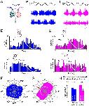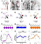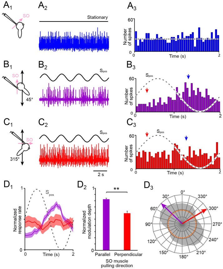 Figure 2. Spontaneous and motion-induced spike discharge of the SO nerve. (AâC) Multi-unit activity of the left SO nerve (color-coded traces in A2,B2,C2) in the absence of motion (A1, 2) and during four cycles of sinusoidal horizontal linear translation on a sled (Spos; black traces in B,C) at 0.5 Hz and 0.49 m/s2peak acceleration; preparations were positioned on the sled such that the SO muscle was oriented parallel (B1) or perpendicular (C1) to the translational motion direction; PSTHs (bin width: 50 ms) of spontaneous (A3) and averaged SO nerve firing rates over a single cycle (dashed sine waves) of sled motion (from n = 20â30 cycles), respectively (B3,C3); the dotted line in (A3) indicates the average resting rate and the arrow heads in (B3,C3) the phase-time of the minimal (red) and maximal (blue) discharge. (D) Mean ± SEM of averaged SO nerve discharge modulation (D1; n = 8 preparations) over a single cycle (dashed sine wave) during linear motion parallel (violet) and perpendicular (red) to the SO muscle pulling direction; bar plot (D2) of normalized SO nerve firing rate modulation during translation parallel (violet) and perpendicular (red) to the SO eye muscle pulling direction (n = 8); significance of difference between the normalized response rates during motion in the two directions is indicated (**p ⤠0.01; Wilcoxon signed-rank test); polar plot (D3) depicting the directional distribution of SO nerve discharge modulation magnitudes across 360° of translational motion (gray area) and preferential (violet arrow) and approximately orthogonal response vectors (red arrow); the dotted orange circle in D3 indicates the average resting rate. SO, superior oblique; Spos, stimulus position of the sled.