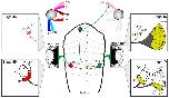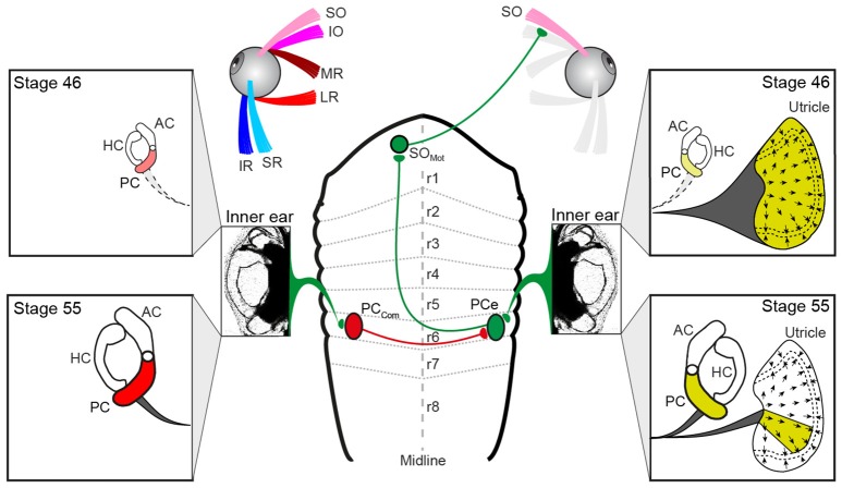 Figure 6. Schematics depicting the hindbrain connectivity of vestibular endorgans and the SO eye muscle along with the developmental changes in utricular and semicircular canal contributions during the developmental tuning of the SO nerve response vector. At stage 46, SO nerve responses derive from the entire utricle (yellow labeling on the right), whereas at stage 55, SO nerve responses derive from a utricular sector that aligns with the PC on the same side; the spatial restriction of the response vector in the direction perpendicular to the SO muscle derives from the contralateral PC (red labeling on the left) and is potentially mediated by midline crossing inhibitory pathways. AC, PC, HC, anterior, posterior vertical, horizontal semicircular canal; IO, inferior oblique; IR, inferior rectus; LR, lateral rectus; MR, medial rectus; PCe, excitatory PC neuron; r1-8, rhombomere 1-8; SO, superior oblique; SR, superior rectus, PCcom, posterior canal commissural neuron; SOMot, superior oblique motoneuron.
