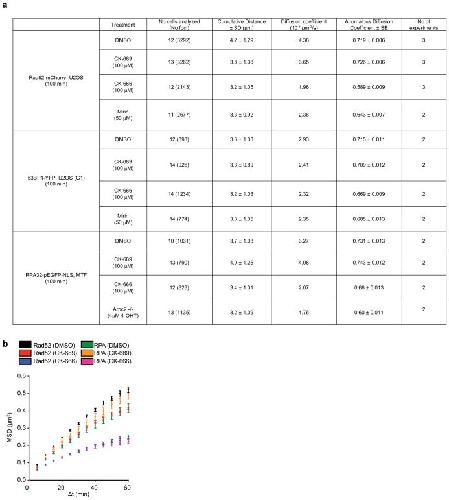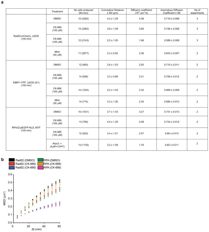 Extended Data Fig. 2. CK-689 does not significantly impact foci movementa, Summary of DSB movement analyses as related to Figures 3, 6, and Extended Data Figure 5. b, MSD of Rad52-mCherry foci and RPA-pEGFP-NLS foci treated with DMSO, CK-689 and CK-666. (Data shown as mean and weighted s.e.m.; Rad52: CK-689 n=3262 foci from 13 nuclei, CK-666 n=2143 foci from 12 nuclei, DMSO n=3292 foci from 12 nuclei. RPA32: CK-689 n=790 foci from 13 nuclei, CK-666 n=823 foci from 12 nuclei, DMSO n=1031 foci from 10 nuclei). MSD of Rad52 DMSO also shown in Fig. 6i. MSD of Rad52 CK-689 and CK-666 also shown in Fig. 3g. MSD of RPA CK-689 and CK-666 also shown in Fig. 3l.