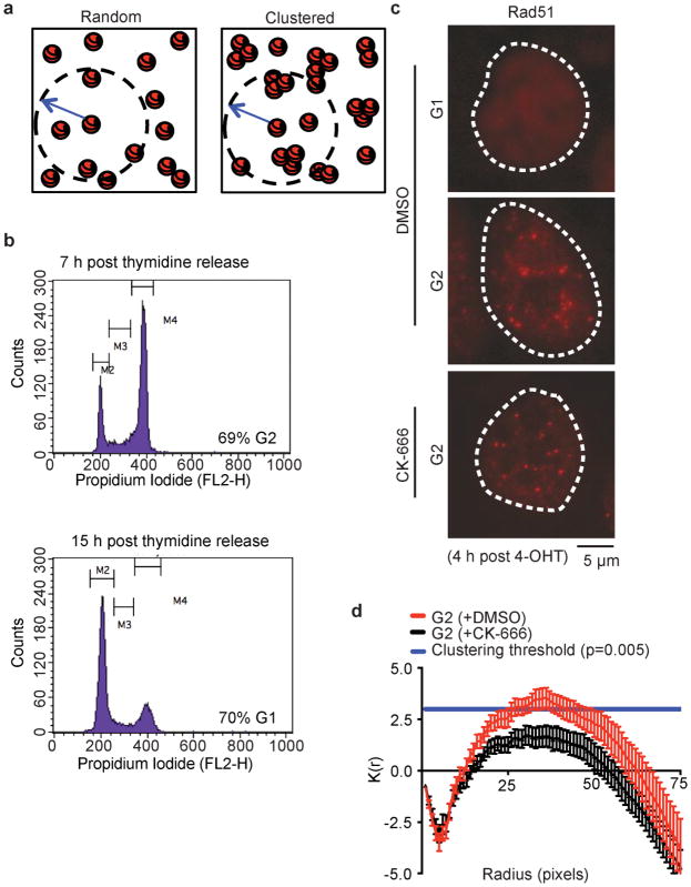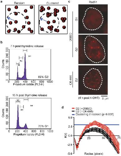 Extended Data Fig. 3. Arp2/3 clusters Rad51 focia, Schematic of clustering events. b, Representative cell cycle distribution of U2OS cells following double-thymidine block (out of five independent experiments). c, Representative images of U2OS-AsiSI nuclei showing Rad51 foci. d, Rad51 foci clustering in G2 cells (P calculated by Spatial analysis plug-in; data shown as mean and s.e.m. of Ripley function; DMSO n=95 nuclei, CK-666 n=80 nuclei).