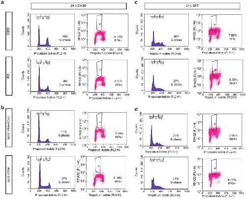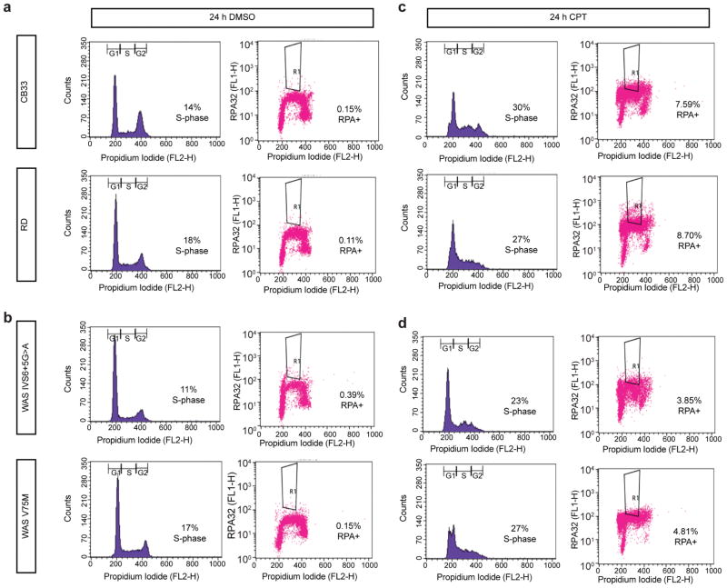Extended Data Fig. 9. B-lymphocytes derived from Wiskott-Aldrich Syndrome patients exhibit reduced DSB end-resectiona, Representative cell cycle distribution of CB33 and RD lymphocytes derived from healthy controls following DMSO treatment is shown (left). The percentage RPA positive S-phase cells following DMSO treatment was measured by flow cytometry (right). (n=4 independent experiments). b, Representative cell cycle distribution of lymphocytes bearing the V75M mutation in the WAS gene or a G>A transition at position 5 in intron 6 of the WAS gene (IVS6+5G>A) is shown following DMSO treatment (left). The percentage RPA positive S-phase cells following DMSO treatment was measured by flow cytometry (right). (n=4 independent experiments). c, Representative cell cycle distribution of CB33 and RD lymphocytes derived from healthy controls following CPT treatment (left). The percentage RPA positive S-phase cells following CPT treatment was measured by flow cytometry (right). (n=4 independent experiments). d, The cell cycle distribution of V75M or IVS6+5G>A lymphocytes following CPT treatment is shown (left). The percentage RPA positive S-phase cells following CPT treatment was measured by flow cytometry (right). (n=4 independent experiments).