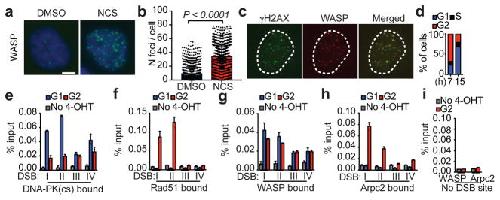 Figure 2. Arp2/3 and WASP co-localize at HDR breaksa, Representative U2OS cells with WASP foci. b, Quantification of WASP foci (P calculated by two-sided Mann-Whitney test; data shown as mean and s.d.; n=1231 (DMSO), 1327 nuclei (NCS). c, γH2AX co-localization with WASP (n=30 nuclei; r=0.60±0.07, Pearson). d, Cell cycle distribution of synchronized ER-AsiSI-U2OS cells post thymidine release. DNA-PKcs (e,) Rad51 (f,) WASP (g,) and Arpc2 (h,) enrichment (ChIP) at DSBs I–IV in G1 and G2. Mean and s.d. (n=3 technical replicates) of a representative experiment (out of two independent experiments). i, Mean and s.d. of Arpc2 and WASP enrichment at an undamaged site in G2 cells (n=3 technical replicates) of a representative experiment (out of two independent experiments). Scale bar is 10 μm.