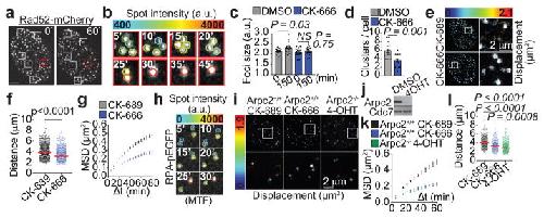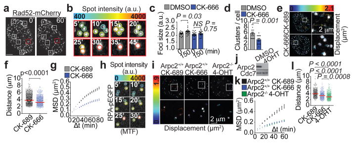 Figure 3. Arp2/3 drives DSB mobility during HDRa, A representative U2OS nucleus with boxes indicating Rad52-mCherry foci clustering events. b, Expanded images of clustering from a, red box. Circles denote foci intensity. c, Rad52 foci size (P calculated by one-way ANOVA with multiple comparisons; data shown as mean and s.e.m.; n=19 (DMSO), 17 nuclei (CK-666). d, Rad52-mCherry clustering events (P calculated by two-tailed Mann-Whitney test; data shown as mean and s.e.m.; n=17 (DMSO), 16 nuclei (CK-666). e, Rad52-mCherry foci traces over 100 min. Expanded images of boxed tracks (right). f, Median cumulative distance traveled by Rad52-mCherry foci. P calculated by two-tailed Mann-Whitney test; n=1120 foci from 13 nuclei (CK-689), 720 foci from 12 nuclei (CK-666). g, Mean square displacement (MSD) of Rad52-mCherry foci. Data shown as mean and weighted s.e.m.; n=3262 foci from 13 nuclei (CK-689), 2143 foci from 12 nuclei (CK-666). Δt=time interval. h, pEGFP-RPA32-NLS foci clustering in MTFs. i, RPA32-pEGFP-NLS foci traces over 100 min. j, Arpc2 protein levels in whole-cell lysates from Arpc2-LoxP-CreER MTFs (single experiment). k, Median cumulative distance traveled by RPA32-pEGFP-NLS foci. P calculated by one-way ANOVA with multiple comparisons; n=381 foci from 13 nuclei (CK-689), 370 foci from 12 nuclei (CK-666), 425 from 13 nuclei (4-OHT). l, RPA32-pEGFP-NLS foci MSD (Data shown as mean and weighted s.e.m.; n=790 foci from 13 nuclei (CK-689), 823 foci from 12 nuclei (CK-666), 1135 foci from 13 nuclei (4-OHT). Scale bar is 5 μm or as indicated.