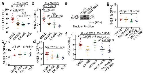 Figure 5. WASP and Arp2/3 mediate HDRa, Summary of DR-GFP (HDR) assay (n=10, 6, 4, 4 left to right). ns, not significant. b, Summary of SA-GFP (SSA) assay (n=7, 4, 4, 3 left to right). c, Summary of EJ2-GFP (MMEJ) assay (n=4, 3, 3, 3, left to right). d, Summary of EJ5-GFP (NHEJ) assay (n=14, 6, 6, 3, left to right). e, Western blot shows FLAG-WT-NLS or FLAG-R62D-NLS overexpression in U2OS nuclear soluble fraction (single experiment). f, DR-GFP assay in cells transfected with FLAG-WT-NLS or FLAG-R62D-NLS. (n=7, 7, 7, left to right). HDR efficiency in the presence of DMSO or CK-666 (Fig. 5a) shown for comparison. g, EJ5-GFP assay in cells transfected with FLAG-WT-NLS or FLAG-R62D-NLS. (n=6, 6, 6, left to right). For 5a–g, P calculated by one-way ANOVA with multiple comparisons as indicated; data shown as mean and s.e.m. n represents independent experiments.