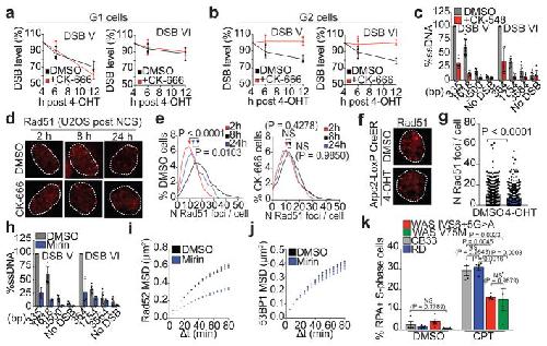 Figure 6. Arp2/3 facilitates resection and repair in G2a, DSB repair at DSBs V-VI in G1-synchronized, ER-AsiSI-AID U2OS cells. Mean and s.d. (n=3 technical replicates) of a representative experiment shown. b, DSB repair at DSBs V-VI in G2-synchronized ER-AsiSI-AID U2OS cells. Mean and s.d. (n=3 technical replicates) of a representative experiment shown. c, Enrichment of single-stranded DNA (ssDNA) at DSBs V–VI following CK-548 treatment. (Data shown as mean and s.d., n=6 replicates from 2 independent experiments). d, Representative images of U2OS nuclei showing Rad51 foci. e, Quantification of Rad51 foci (P calculated by one-way ANOVA with multiple comparisons; smoothed traces show distribution of Rad51 foci. Arrow above respective curves indicates mean number of foci per cell; DMSO: 2 hours n=1830 cells, 8 hours n=2440 cells, 24 hours n=782 cells, CK-666: 2 hours n=2438 cells, 8 hours n=2189 cells, 24 hours n=912 cells). f, Representative images of Arpc2-LoxP-CreER MTF nuclei showing Rad51 foci. g, Quantification of Rad51 foci in MTFs (P calculated by two-tailed Mann-Whitney test; data shown as mean; n=571 nuclei (DMSO), 462 nuclei (4-OHT). h, Representative ssDNA enrichment at DSBs V–VI following mirin treatment. (Data shown as mean and s.d.; n=3 replicates of 2 independent experiments). ssDNA in DMSO-treated cells (Fig. 5c) shown for comparison. i, MSD of Rad52-mCherry foci (Data shown as mean and weighted s.e.m.; DMSO n=3292 foci from 12 cells, Mirin n=2677 foci from 11 cells). j, MSD of 53BP1-YFP foci in G1 cells (Data shown as mean and weighted s.e.m.; DMSO n=893 foci from 12 cells, Mirin n=744 foci from 14 cells). k, Quantification of chromatin-bound RPA in S-phase cells (P calculated by two-way ANOVA with multiple comparisons; data shown as mean and s.e.m.; n=4 independent experiments).