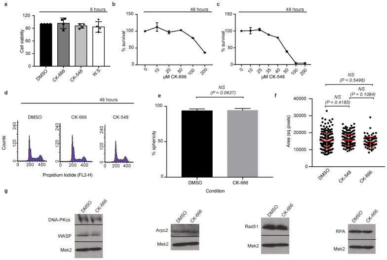 Extended Data Fig. 4. WASP and Arp2/3 inactivation do not impair U2OS cell viability, nuclear area, nuclear sphericity or protein expressiona, Cell survival after 8 hours of 100 μM CK-666, 50 μM CK-548, or 3 μM Wiskostatin treatment. Data shown as mean and s.e.m. n=4 independent experiments. b, Cell survival after 48 hours of increasing concentrations of CK-666. n=3 independent experiments. Data shown as mean and s.e.m. c, Cell survival after 48 hours of increasing concentrations of CK-548. n=3 independent experiments. Data shown as mean and s.e.m. d, Representative cell-cycle distribution of cells treated with DMSO, 50 μM CK-666, or 25 μM CK-548 for 48 hours (out of three independent experiments). e, Analysis of nuclear sphericity (P calculated by Student’s two-tailed t-test; data shown as mean and s.d.; DMSO n=117 nuclei, CK-666 n=117 nuclei). ns, not significant. f, Analysis of nuclear area (P calculated by one-way ANOVA with multiple comparisons; data shown as mean and s.d.; DMSO n=210 nuclei, CK-548 n=189 nuclei, CK-666 n=92 nuclei). g, Expression of Rad51, DNA-PK(cs), WASP, and Arpc2 validating antibodies employed in Fig. 2e–i (single experiment). Mek2 is a loading control. RPA expression levels also shown.