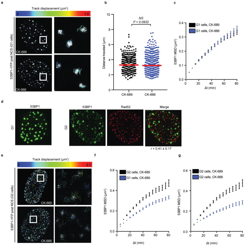 Extended Data Fig. 5. Arp2/3 enhances movement of 53BP1 foci in G2a, Representative U2OS nuclei showing 53BP1-YFP foci traces over 100 min in G1 cells b, Median cumulative distance traveled by 53BP1-YFP foci in G1 cells (P calculated by two-tailed Mann-Whitney test; CK-689 n=462 foci from 14 nuclei, CK-666 n=647 foci from 14 nuclei). ns, not significant. c, MSD of 53BP1-YFP foci in G1 cells (Data shown as mean and weighted s.e.m.; CK-689 n=926 foci from 14 nuclei, CK-666 n=1234 foci from 14 nuclei). Δt = time interval. d, A representative G1 cell is shown with 53BP1-YFP foci (left). A representative G2 cell is shown with 53BP1-YFP and Rad52-mCherry foci (right). 53BP1 foci colocalize with Rad52 foci (r = 0.41 ± 0.17, Pearson, n=5 independent experiments). e, Representative U2OS nuclei showing 53BP1-YFP foci traces over 100 min in G2 cells. f, MSD of 53BP1-YFP foci (Data shown as mean and weighted s.e.m.; G1 CK-689 n=926 foci from 14 nuclei, G2 CK-689 n=1403 from 12 nuclei). G1 CK-689 curve also shown in (c). g, MSD of 53BP1-YFP foci in G2 cells (Data shown as mean and weighted s.e.m.; CK-689 n=1403 foci from 12 nuclei, CK-666 n=1038 foci from 10 nuclei). G2 CK-689 curve also shown in (f).