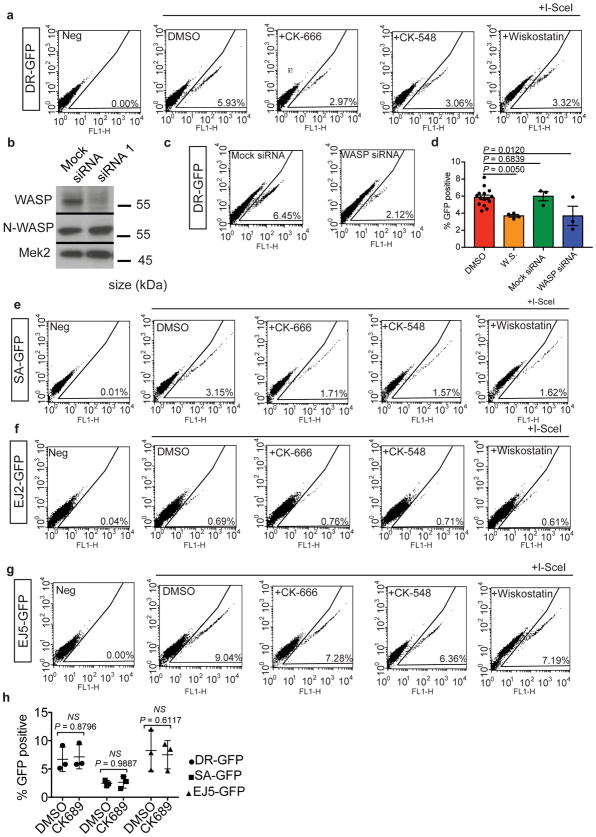Extended Data Fig. 7. WASP and Arp2/3 mediate DSB repair by homology-directed mechanismsa, Representative FACS plots of GFP+ cells in the HDR (DR-GFP) assay. b, Western blot shows expression of WASP and N-WASP following siRNA knockdown in whole cell lysates (single experiment). WASP siRNA 1: 5′-GAGUGGCUGAGUUACUUGC-3′. c, Representative FACS plots of GFP+ cells in the HDR (DR-GFP) assay in WASP and mock-depleted cells. d, Summary of DR-GFP assay with WASP depletion (P calculated by one-way ANOVA with multiple comparisons; data shown as mean and s.e.m; n=3 independent experiments). HDR efficiency in the presence of DMSO or Wiskostatin (Fig. 5a) shown for comparison. e, Representative FACS plots of GFP+ cells in the SSA (SA-GFP) assay. f, Representative FACS plots of GFP+ cells in the MMEJ (EJ2-GFP) assay. g, Representative FACS plots of GFP+ cells in the NHEJ (EJ5-GFP) assay. h, Summary of DR-GFP, SA-GFP, and EJ5-GFP assays with CK-689 (P calculated by two-way ANOVA with multiple comparisons; data shown as mean and s.d.; n=3 independent experiments). n.s = not significant.