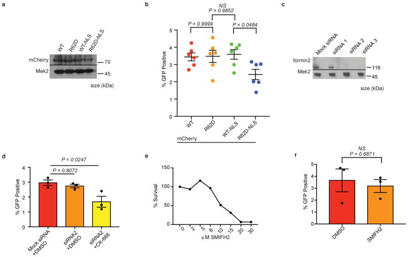 Extended Data Fig. 8. Actin nucleation regulates HDR in the nucleus and does not require formin-2 activitya, Western blot shows expression of mCherry-tagged actin constructs in U2OS whole cell lysates (single experiment). b, Summary of DR-GFP (HDR) assay (P calculated by one-way ANOVA with multiple comparisons; data shown as mean and s.e.m; n=6 independent experiments). c, Western blot shows knockdown of formin-2 following 48 hr transfection of mock or sequence-specific siRNA oligos (single experiment). Formin-2 siRNA #2: 5′-CGUGUAAUCAGAAUGCCCA-3′. d, Summary of DR-GFP assay (P calculated by one-way ANOVA with multiple comparisons; data shown as mean and s.e.m; n=3 independent experiments). e, Mean cell survival after 48 hours of increasing concentrations of the formin inhibitor, SMIFH2 (n=3 independent experiments). f, Summary of DR-GFP assay (P calculated by student’s two-tailed t-test; data shown as mean and s.e.m; n=3 independent experiments).