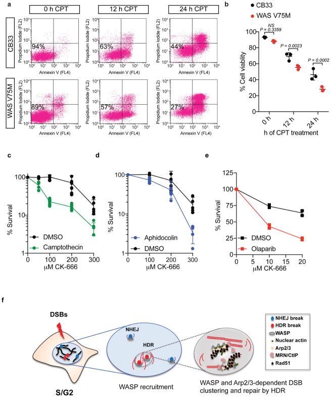 Extended Data Fig. 10. Arp2/3 inactivation confers sensitivity to DSBs induced in S-phase as well as replication stress-inducing agentsa, Control CB33 lymphocytes or lymphocytes bearing a V75M mutation in the WAS gene were treated with camptothecin (CPT) for 0, 12, or 24 hours. Percent viability following CPT treatment was assessed by measuring the fraction of Annexin V and propidium iodide negative cells by flow cytometry. b, Summary of CB33 or WAS V75M lymphocyte survival following CPT treatment (P calculated by two-way ANOVA with multiple comparisons; data shown as mean and s.d.; n=3 independent experiments) c, Clonogenic U2OS cell survival after 12 hr of camptothecin treatment in the presence of DMSO or increasing concentrations of CK-666. (Triplicate experiments; data shown as mean and s.d.; n=2 independent experiments). d, Clonogenic U2OS cell survival after 12 hr of aphidicolin treatment in the presence of DMSO or increasing concentrations of CK-666. (Triplicate experiments; data shown as mean and s.d.; n=2 independent experiments). e, Clonogenic U2OS cell survival after olaparib treatment in the presence of DMSO or increasing concentrations of CK-666 for 14 days. (Triplicate experiments; data shown as mean and s.e.m.; n=2 independent experiments). f, DNA damage induces DSBs, which are repaired preferentially by NHEJ in mammalian cells (in blue). In S/G2, DSBs may be repaired by HDR (in red). All DSBs recruit WASP, but Arp2/3-dependent actin polymerization occurs only at HDR breaks, which become more mobile. Actin polymerization in the vicinity of DSBs generates forces resulting in DSB clustering, optimal DNA end resection, Rad51 foci formation, and HDR.