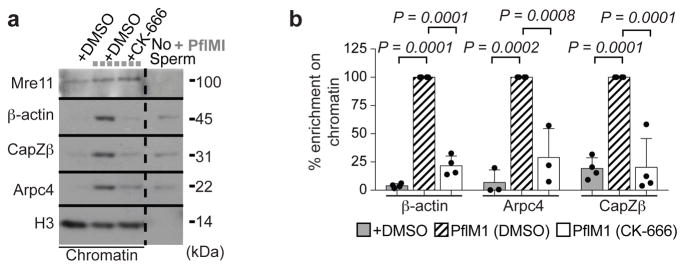 Figure 1. Actin complexes are recruited to damaged chromatina, Enrichment of actin complexes in damaged chromatin (+PflMI) by Western blot. Mre11 indicates DNA damage. b, Protein quantification in chromatin relative to +PflMI samples. (P calculated by one-way ANOVA with multiple comparisons; data shown as mean and s.d.; n=5, 3, and 4 independent experiments, left to right).