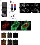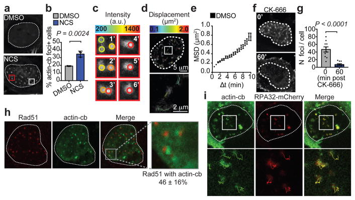 Figure 4. Nuclear actin foci cluster and localize to HDR sitesa, Representative images of U2OS nuclei transfected with nuclear actin-chromobody-tag-GFP (actin-cb). Boxes indicate clustering events. b, Percentage of actin-cb foci positive cells (P calculated by Student’s two-tailed t-test; data shown as mean and s.d.; n=473 nuclei (DMSO), 473 nuclei (NCS). c, Expanded images of a clustering event from (a, red box). Circles denote foci intensity. d, Representative traces of actin-cb foci (out of 3 independent experiments) over 10 min. e, MSD of actin-cb foci (Data shown as mean and weighted s.e.m.; DMSO n=662 foci from 11 nuclei). f, Representative images of a U2OS nucleus with actin-cb foci following CK-666 treatment. g, Quantification of actin-cb foci prior to and post CK-666 treatment (P calculated by paired two-tailed t-test; data shown as mean and s.e.m.; n=10 nuclei from 2 independent experiments). h, Representative images of a U2OS nucleus showing Rad51 co-localization with actin-cb foci. The percentage of Rad51 foci that overlap or touch actin-cb foci shown (n=12 nuclei). i, Representative images of a U2OS nucleus (from five independent experiments) showing traces of RPA32-mCherry-NLS foci (red) and actin-cb foci (green). Scale bar is 5 μm or as shown.