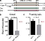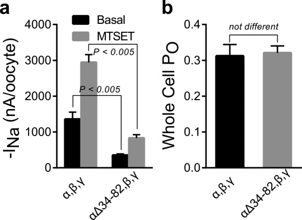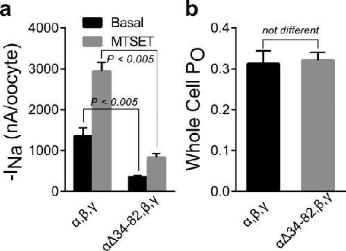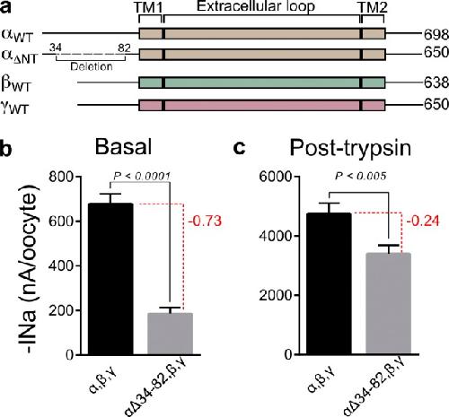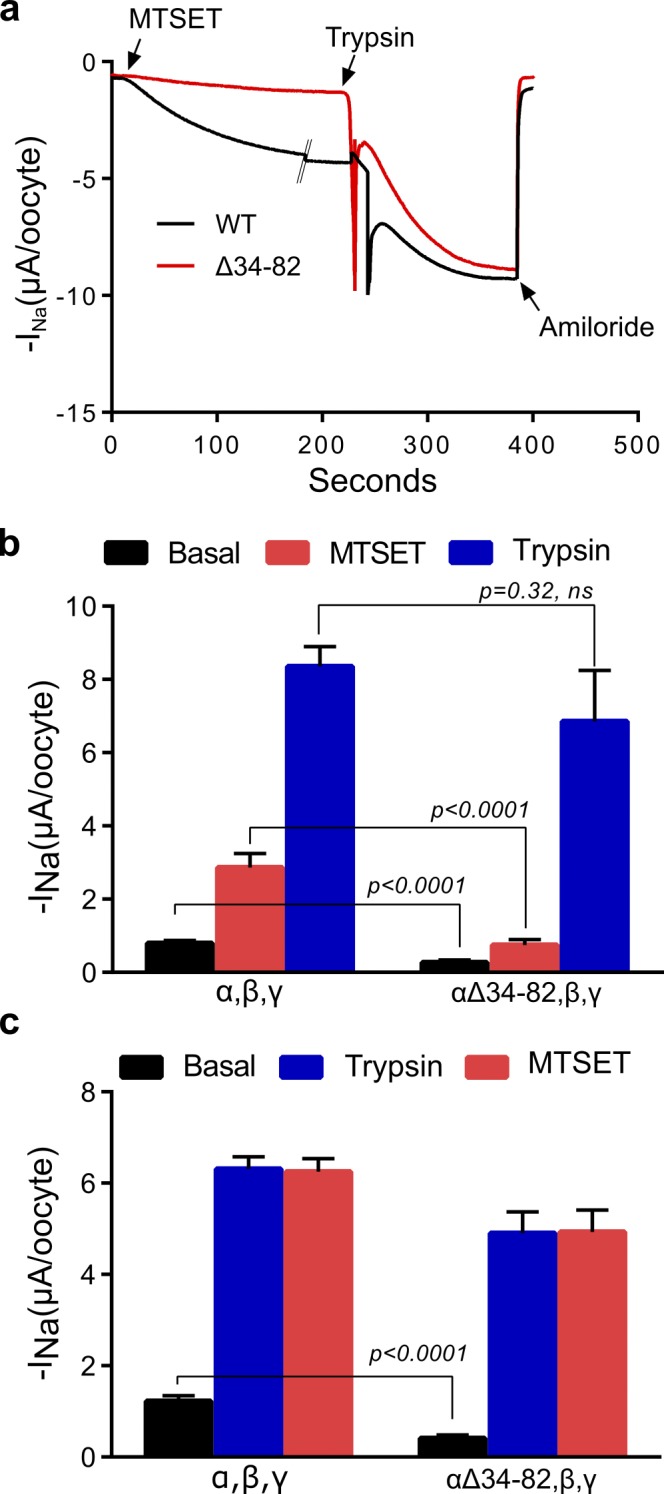 Figure 3. Trypsin overcomes αΔ34–82-ENaC resistance to MTSET. Oocytes injected with ENaC subunits, as in Fig. 2, with β-ENaCS518C replacing the WT β-ENaC RNA. (a) Representative two-electrode voltage clamp current traces illustrating WT (black trace) and αΔ34–82-ENaC (red trace) response to MTSET, followed by trypsin. (b) Summary data from the previous panel (a). n = 14 oocytes/group from three frogs. (c) After trypsin, αΔ34–82-, β-, and γ-ENaC was not resistant to MTSET. Similar experiment as in the other two panels (a and b), but trypsin exposure preceded MTSET. n = 6/group. Error bars represent mean ± SEM.