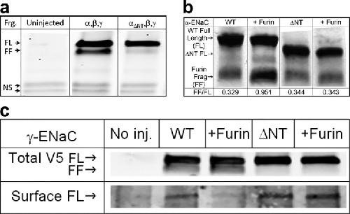 Figure 4. The splice variant αΔNT reduces γ-ENaC furin site cleavage. (a) Crude membrane samples of uninjected oocytes or oocytes injected with WT or ΔNT α-ENaC plus WT β-ENaC and HA/V5 epitope-tagged γ-ENaC were prepared as described in Materials and methods and subjected to PAGE and blotted for the V5 epitope tag. In WT α-, β-, and γ-ENaC, samples appeared as a band consistent with full-length (FL) γ-ENaC and a more rapidly migrating band predictive of cleavage at the γ-ENaC furin site (FF). Deletion of N-terminal residues of α-ENaC sharply diminished FF staining in total and as a fraction of FL. All lysates generated a doublet unrelated to ENaC (NS). This result is representative of multiple similar experiments. (b) WT or ΔNT α-ENaC was injected, along with WT β-ENaC and γ-ENaC, to comprise two experimental groups of 60 oocytes each. One-half of each group was also injected with furin RNA (1.0 ng/oocyte). α-ENaCs were V5 epitope tagged at the C terminus. Samples were processed and analyzed as in the previous panel (a). Full-length ΔNT α-ENaC (labeled ΔNT FL) migrated faster than WT FL, as expected. Fragments consistent with furin cleavage—furin frag (FF)—migrated identically, as expected for C-terminal V5-tagged fragments. The fraction of FF/FL in each condition was obtained from densitometry and is indicated beneath each lane. Similar results were obtained in other trials. (c) We mutated residue 133E of γ-ENaCHA/V5 to 133C and coexpressed the mutant with WT β-ENaC and WT or ΔNT α-ENaC. After 24 h, oocytes were labeled with 40 µM Alexa Fluor 680 C2 maleimide in MBS++ buffer. Labeling was quenched with 10 mM cysteine, and oocytes were washed extensively. Western blots of total lysates, stained for the V5 epitope tag (Total) or for γ-ENaC labeled by fluorescent maleimide (Surface) are shown. Representative of multiple similar experiments.