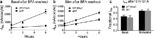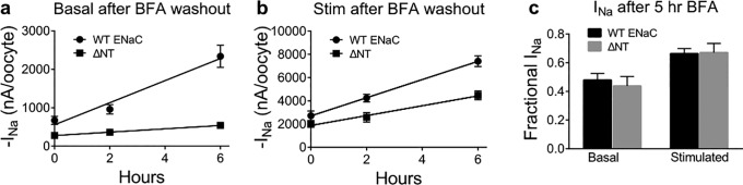 Figure 7. Slower recovery from BFA exposure by αΔNT-ENaC. (a and b) Oocytes injected with WT β- and γ-ENaC subunits with WT or αΔNT-ENaC were incubated overnight in Barth medium containing 10 µM amiloride and 1 µM BFA. The next day, BFA was removed and basal (a) and simulated (b) INa was recorded after 2 and 6 h. Basal INa for WT increased (slope = 287 ± 44 nA/h) more rapidly than for αΔNT-ENaC (slope = 44 ± 17 nA/h). WT stimulated INa also increased (slope = 782 ± 91 nA/h) more rapidly than stimulated INa of αΔNT-ENaC (slope = 425 ± 84 nA/h). There were 10 oocytes in each injection condition, isolated from two frogs. The slopes and associated errors were generated by linear regression analyses and differ significantly (P < 0.01). (c) After overnight incubation in Barth medium with 10 µM amiloride, oocytes were exposed to 3 µM BFA or vehicle (DMSO). INa recorded after 5 h is expressed as fraction of the vehicle control at 5 h (n = 5/injection condition). Error bars represent mean ± SEM.