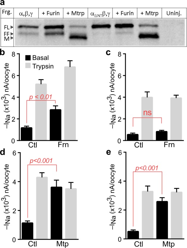 Figure 5. Residues 34–82 of α-NT are not required for γ-ENaC cleavage by matriptase. (a) Oocyte membrane samples prepared as in Fig. 4 were blotted for γ-ENaC (C-terminal V5 epitope tag) expressed with WT α- and β-subunits (three leftmost lanes) or αΔNT- and WT β-subunits (next three lanes to the right). ENaC groups were coinjected with furin or matriptase (Mtrp.). Labeled bands identify γ-ENaC as full length (FL), furin fragment (FF), and matriptase fragment (M). (b–e) Stimulation of INa by coexpressed furin (WT ENaC; b), (αΔNT-ENaC; c), or by coexpressed matriptase (WT ENaC; d), (αΔNT-ENaC; e). After recording basal INa (black bars), recording continued in the presence of 2 µg/ml. Current in each condition was normalized to stimulated INa in the control group. Error bars are mean ± SEM (10–15 recordings/group from two or three oocyte batches/condition).