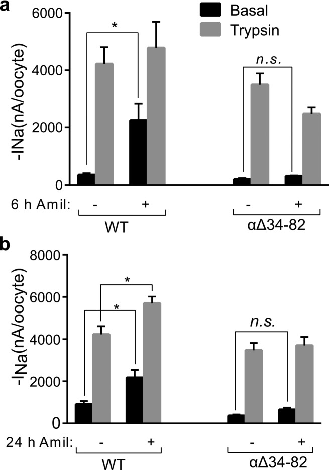 Figure 6. Amiloride stimulation of INa is impaired in αΔ34–82-ENaC. (a) Oocytes injected and incubated in Barth medium for 20 h and recorded as in Fig. 1 (−Amil). Oocytes from each injection group were then incubated in Barth medium with amiloride (10 µM) for 6 h and recorded (+Amil). (b) Oocytes were injected as in Fig. 1 and incubated for 24 h in Barth medium with or without 10 mM amiloride. Basal and trypsin-stimulated INa was recorded as above. Data collected from two to three oocyte batches, n = 6–18 recordings/condition. *, P < 0.05 for difference from −Amil by two-way ANOVA. Error bars represent mean ± SEM.