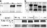 Figure 1. Deletion of residues 34–82 of α-ENaC reduces ENaC current. (a) Topologic representations of rat α-, β-, and γ-ENaC subunits. The α-ENaC splice variant with the missing residues is shown as dashed lines. (b and c) WT or splice variant α-ENaC cRNA was injected into Xenopus oocytes with WT β- and γ-ENaC. Amiloride-inhibited current (INa) was recorded 20–24 h after injection. Trypsin (2.0 µg/ml) was added during continuous recording. n = 15 separate oocytes collected from three donor frogs. Mean basal INa (b) decreased by 73% and trypsin-stimulated INa (c) decreased by 24%, compared by Student’s t test. Error bars represent mean ± SEM.