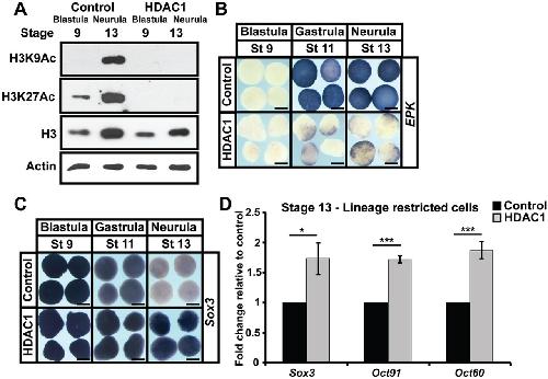 Fig. 6. HDAC1 activity promotes pluripotency gene expression at the expense of lineage restriction. (A) Western blot analysis of lysates of aging animal pole explants from control embryos or embryos injected with HDAC1 mRNA examining H3K9Ac and H3K27Ac alongside total H3 and actin levels. Explants were grown alongside sibling embryos until late blastula (stage 9) and neural plate (stage 13) stages. (B,C) In situ hybridization examining epk and sox3 expression in aging animal pole explants from control embryos or embryos injected with HDAC1 mRNA. Explants were cultured alongside sibling embryos until late blastula (stage 9), mid-gastrula (stage 11) and neural plate (stage 13) stages. (D) qRT-PCR of explants from control embryos or embryos injected with HDAC1 mRNA examining expression of pluripotency genes (*P<0.05, ***P<0.005). Explants were cultured alongside sibling embryos until the neural plate stage (stage 13). Scale bars: 250 μm.