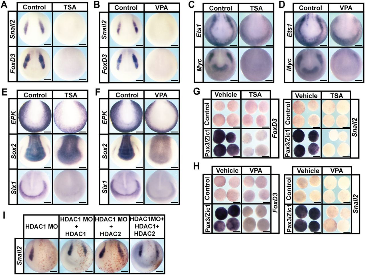 mM VPA (H)]. Explants were cultured alongside sibling embryos grown until late neurula stages (stage 18). (I) In situ hybridization examining the expression of neural crest factor snail2 in embryos after morpholino-mediated knockdown of HDAC1, and rescued with co-injection of HDAC1, HDAC2 or HDAC1+HDAC2 mRNA. Embryos were injected at the eight-cell stage and collected at mid-neurula stages (stage 15). Scale bars: 250 μm.