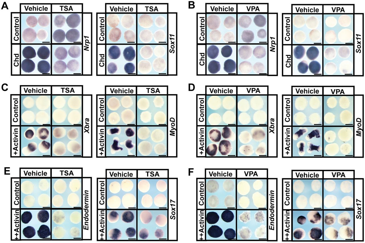 mM VPA (B)]. Explants were cultured alongside sibling embryos grown until late neurula stages (stage 18). (C-F) In situ hybridization examining expression of mesodermal markers xbra and myod and endodermal markers endodermin and Sox17 in animal pole explants induced with Activin and treated with vehicle (DMSO or water) or inhibitor [500â