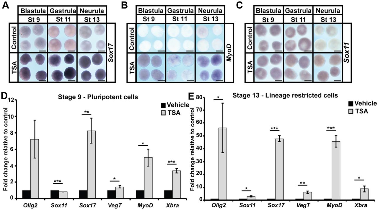 nM TSA) (*P<0.05, **P<0.01, ***P<0.005). Explants were cultured alongside sibling embryos until late blastula (stage 9) and neural plate (stage 13) stages. Scale bars: 250 μm.