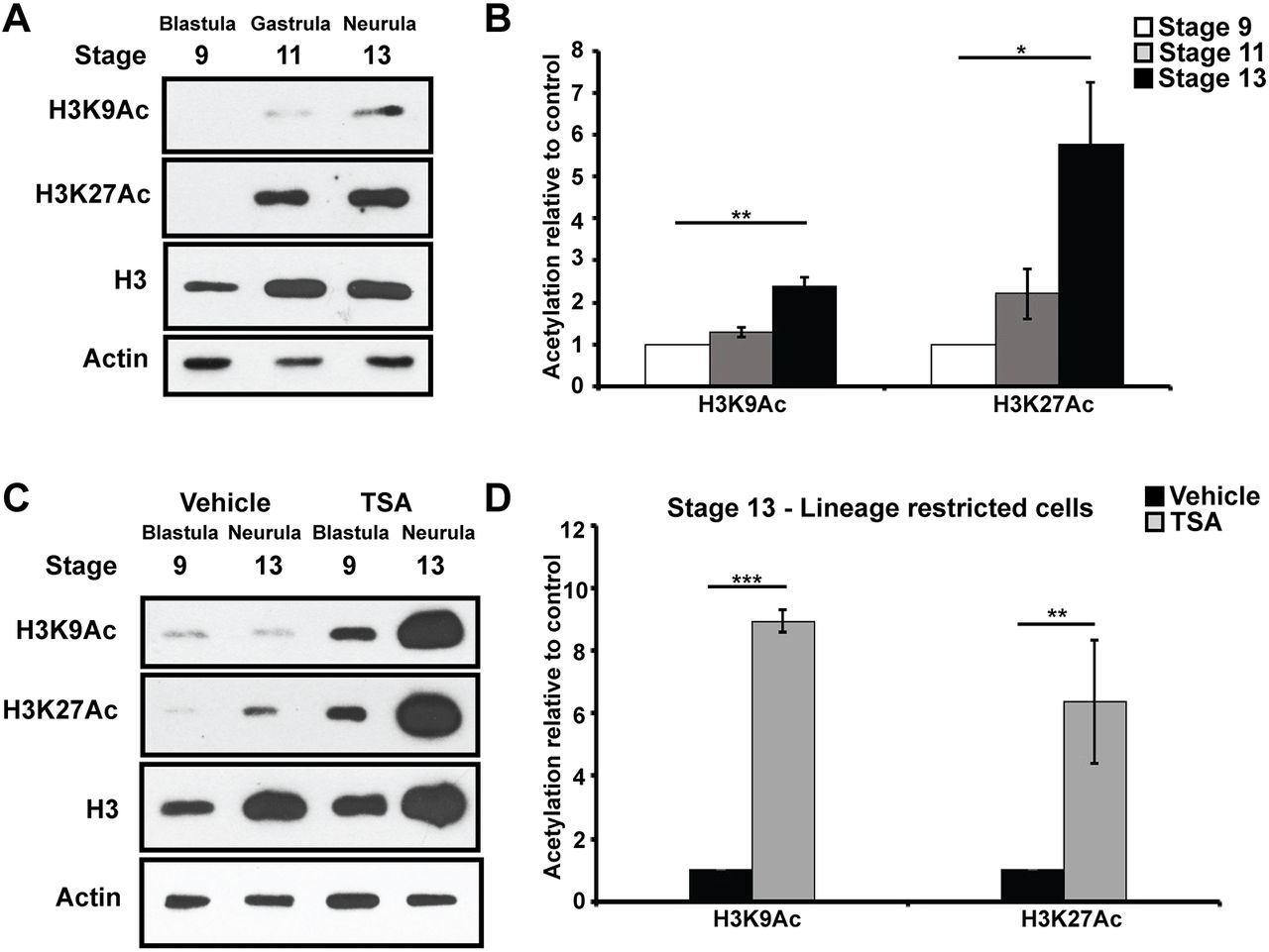 Fig.5. Histone acetylation increases as cells become lineage restricted. (A,B) Western blot analysis of lysates of aging animal caps examining H3K9Ac and H3K27Ac alongside total H3 levels via chemiluminescence (A) and quantified using Odyssey (B) (*P<0.05, **P<0.01). Explants were cultured alongside sibling embryos until late blastula (stage 9), mid-gastrula (stage 11) and neural plate (stage 13) stages. (C,D) Western blot analysis of lysates of aging animal caps treated with vehicle (DMSO) or inhibitor (500â