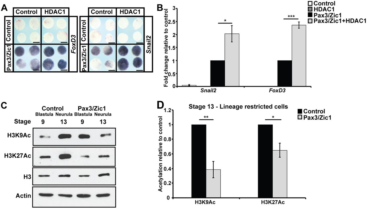 Fig. 7. HDAC activity promotes neural crest formation. (A,B) In situ hybridization (A) and qRT-PCR (B) examining snail2 and foxd3 expression in animal cap explants induced with levels of Pax3/Zic1 titrated for weak neural crest establishment, with/without co-expression of HDAC1 (*P<0.05, ***P<0.005). Explants were cultured with sibling embryos until late neurula stages (stage 18). (C,D) Western blot analysis of lysates of control explants and explants induced with Pax3/Zic1 examining H3K9Ac and H3K27Ac alongside total H3 levels via chemiluminescence (C) and quantified using Odyssey (D) (*P<0.05, **P<0.01). Explants were cultured alongside sibling embryos until late blastula (stage 9) and neural plate (stage 13) stages. Scale bars: 250 μm.