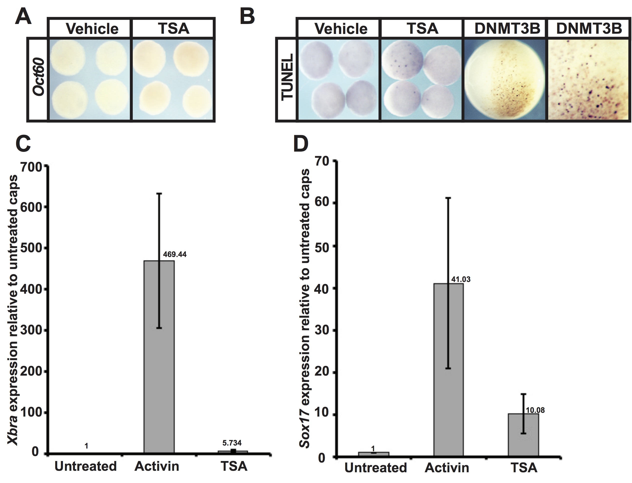 TSA treated animal cap explants alongside positive control DNMT3B injected embryos. Explants were cultured alongside sibling embryos until neural plate stages (stage 13). (C),(D) qRT-PCR examining Xbra(C) and Sox17(D) in animal pole explants after vehicle or inhibitor (TSA-500nM) or Activin induction. Explants were cultured alongside sibling embryos until mid-gastrula stages (stage 11.5).