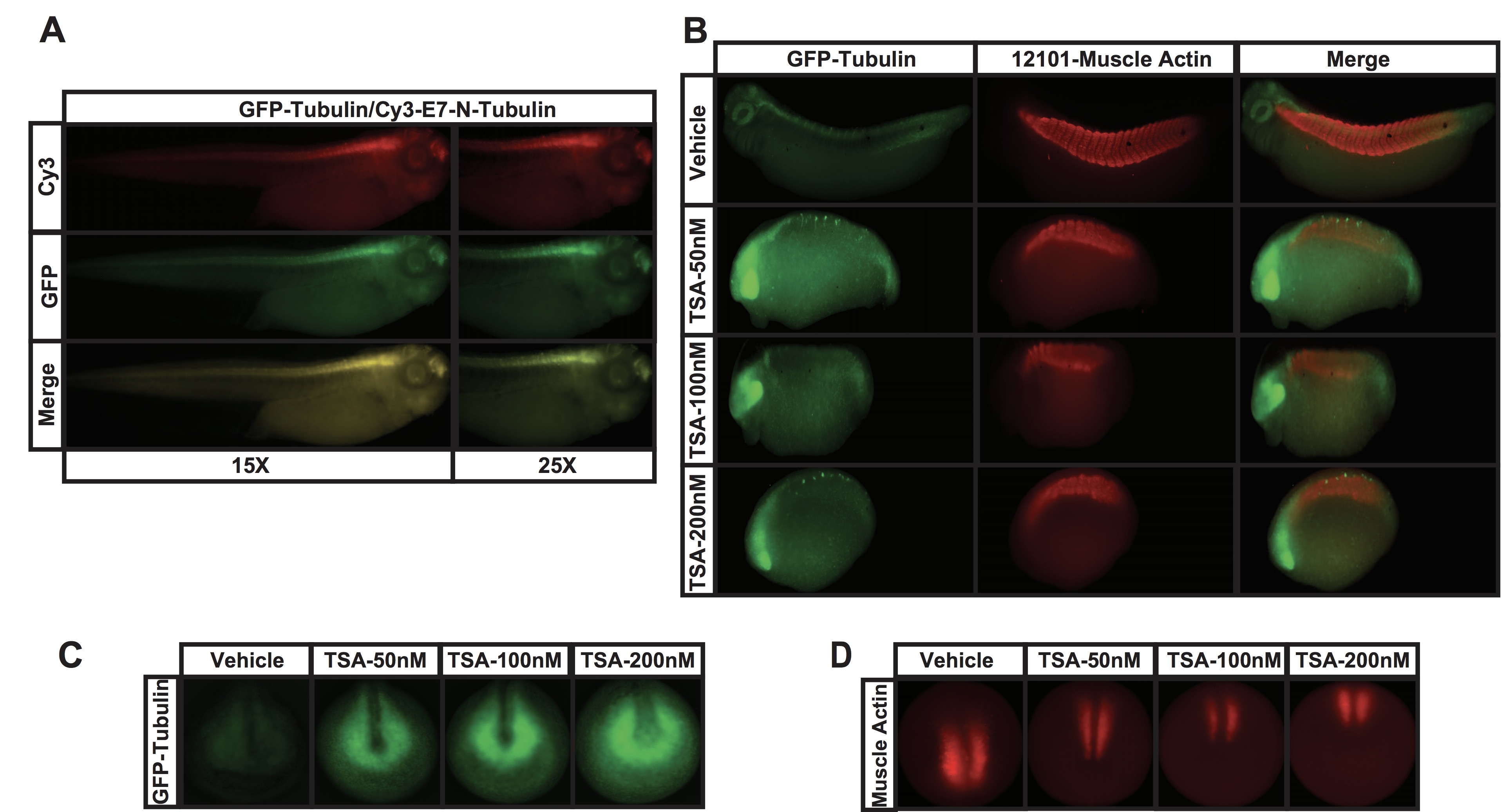 amounts of TSA (50nM-200nM). Embryos were treated at mid-gastrula stages (stage 11). (C) Tubb2-GFP transgenic embryos following treatment with vehicle or TSA (50nM â 200nM). Embryos were treated at mid-gastrula stages (stage 11). (D) Immunofluorescence examining 12101- muscle actin staining on embryos after treatment with vehicle or TSA (50nM â 200nM). Embryos were treated at mid-gastrula stages (stage 11).