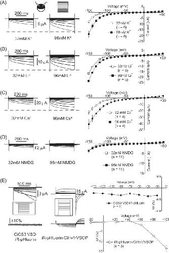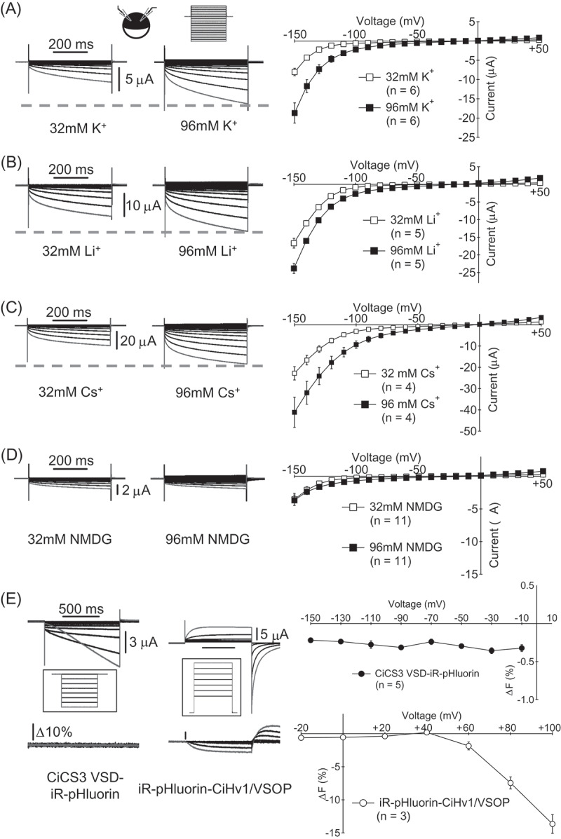 Figure 1. Permeability of CiCS3 VSD to monovalent cations (A-D) Current traces and I-V relationships of the recordings (mean ± SEM) for examining K+ (A), Li+ (B), Cs+ (C) and NMDG (D) permeability. The same cells were recorded in the solutions with two different concentrations of cations. Voltage steps were from + 50 mV to â150 mV by 10 mV decrement. Holding potential (Vh) was at â10 mV. The current evoked by a step pulse to â150 mV is colored by red. (E) Test of proton permeability. Currents and fluorescence changes of iR-pHluorin were recorded from an oocyte expressing CiCS3 VSD-iR-pHluorin (left) or iR-pHluorin-CiHv1/VSOP (right) in the pH6 solution. Voltage steps for CiCS3 VSD-iR-pHluorin were from â150 mV to â10 mV. Vh was â10 mV. The voltage steps for iR-pHluorin-CiHv1/VSOP expressing cells were from â20 mV to + 100 mV. Vh was â80 mV.