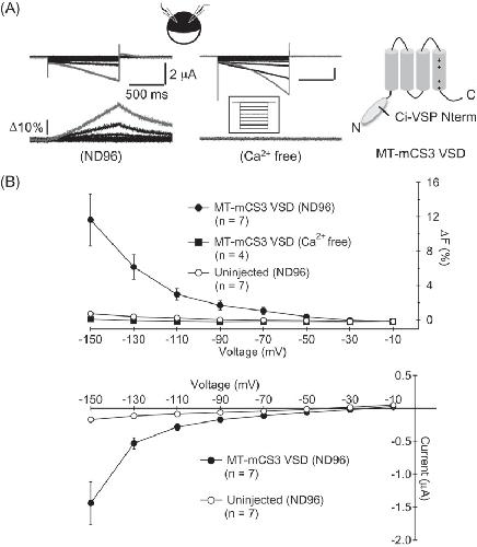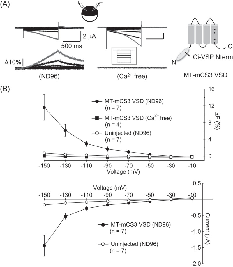 Figure 3. The ion permeation paths induced by the MT-mCS3 VSD are permeable to Ca2+ [2]+ . (A) Representative current traces and fluorescence changes from oocytes expressing the MT-mCS3 VSD bathed in ND96 (Left) or Ca2+ free solution (Right). The voltage steps were from −150 mV to −10 mV by 20 mV increment. Vh was at −10 mV. The traces evoked by a step pulse to −150 mV are colored by red. The recordings in ND96 and Ca2+ free solution were from different cells. (B) Fluorescence-Voltage relationships (upper) and Current-Voltage relationships (lower) of the recordings (mean ± SEM).