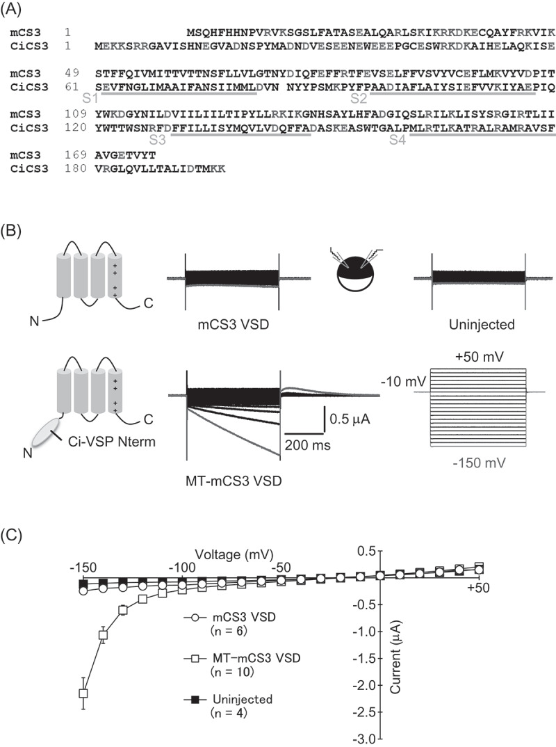 Figure 2. Inward currents are elicited in cells expressing the voltage-sensor domain of murine CatSper3. (A) Alignment of the amino acid sequence of the mCS3 VSD and the CiCS3 VSD (LC329335 in DDBJ). Negatively and positively charged amino acids are colored by red and blue, respectively. The putative trans-membrane regions are indicated by green lines. (B) Representative current traces from Xenopus oocytes injected with the cRNA of the mCS3 VSD (left upper) and the MT-mCS3 VSD (left lower), and an uninjected oocyte (right upper). The bath solution was ND69 solution. Voltage steps were from + 50 mV to â150 mV by 10 mV decrement (right lower). Vh was at â10 mV. The current evoked by a step pulse to â150 mV is colored by red. (C) Current-Voltage relationships of the recordings (mean ± SEM).