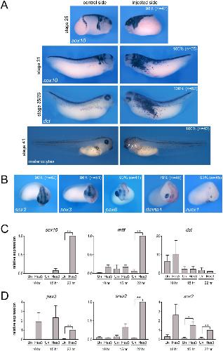 Fig. 4. Hes3 mis-expression induces ectopic pigment cells differentiation. (A) Unilateral injection of hes3GR mRNA (500âpg) at the 2-cell stage followed by Dex treatment at the gastrula stage (NF stage 10.5) induced ectopic sox10 (NF stages 25 and 31) and dct (NF stage 35/36) expression. Sibling embryos at the tadpole stage (NF stage 41) showed supernumerary pigment cells in the head region (arrows). In all panels, lateral views are shown, dorsal to top. (B) At the tailbud stage, hes3GR-injected embryos show a decrease in neural (sox2, sox3 and pax6) and placode (dmrta1 and runx1) gene expression. Anterior views, dorsal to top. Injected side is to the right. (A-B) The frequency of the phenotypes shown (%) and the number of embryos analyzed (n) are indicated in the upper right corner. (C) In animal cap explants, Hes3 is sufficient to activate sox10 and mitf expression (22âh in culture), while dct expression was unchanged over the same period of time. (D) Hes3 is also sufficient to induce pax3 (NPB specifier), snai2 (NC specifier) and sox2 (neural) genes after 22âh in culture. Values are normalized to ef1α and presented as mean±âs.e.m. Statistically significant changes are indicated; (*) pâ<â0.05 and (**) pâ<â0.01 (Student's t-test), from three independent samples.
