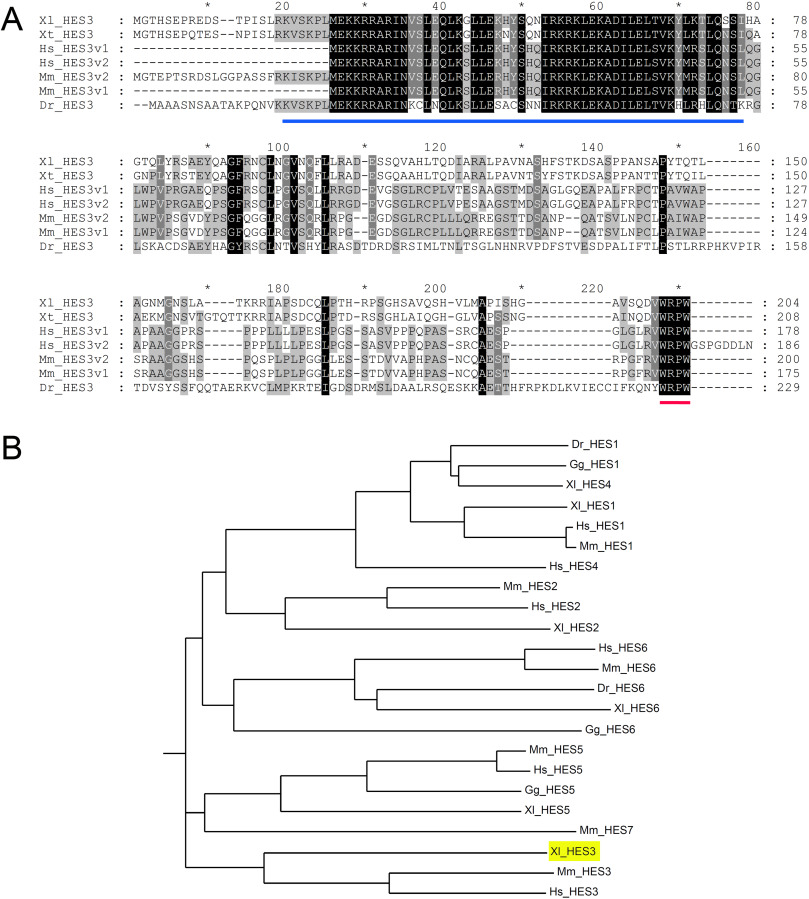 Fig. 1. Sequence comparison of Hes proteins across species. (A) The amino acid sequences of human (Hs), mouse (Mm), zebrafish (Dr), Xenopus tropicalis (Xt), Xenopus laevis (Xl) Hes3 genes were aligned using ClustalX2. Hes3 amino acid conservation among species is highlighted in different shades of grey. The b-HLH is underlined in blue and the Groucho-binding domain is underlined in red. (B) Phylogenetic tree of Hes proteins from Xenopus laevis (Xl), human (Hs) mouse (Mm), chicken (Gg) and zebrafish (Dr).