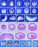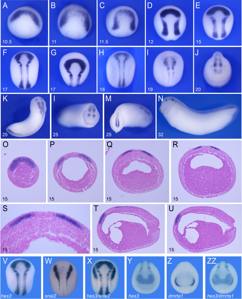 Fig. 2. Developmental expression of Hes3. (A-N) Developmental expression of hes3 visualized by ISH at the gastrula (A-D), neurula (E-J) and tailbud (K-N) stages. (A-I, K) Dorsal views, anterior to top. (J, L) Anterior views, dorsal to top. (M) Posterior view, dorsal to top. (N) Lateral view, dorsal top, anterior to left. (O-R) Serial (anterior to posterior) transverse sections of a neurula stage embryo show the antero-lateral expression domain of hes3 in the neural plate. Dorsal to top. (S) Higher magnification view of panel (R). (T-U) Longitudinal sections highlight the anterior expression domain of hes3. Anterior to left, dorsal to top. (A-U) In each image, the embryonic stage (NF) is indicated in the lower left corner. (V-ZZ) single (V-W, Y-Z) and double (X, ZZ) ISH of neurula stage (NF stage 15) embryos for the genes indicated in the lower left corner of each image. There is no overlap between hes3 and the NC (snai2) or the PPR (dmrta1) genes. (V-X) Dorsal views, anterior to top. (X-ZZ) Anterior views, dorsal to top.